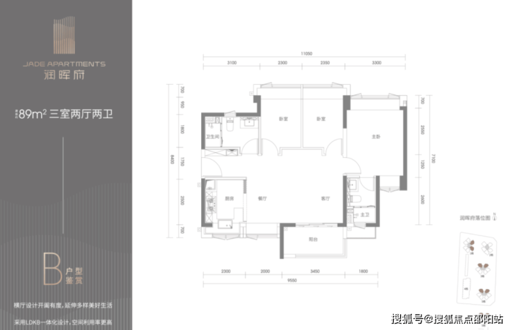 E户型是110㎡四房二卫横厅户型,则是B户型的放大版。西南朝向,户型方正,三个次卧的面积均在9平米以上,主卧18平左右。再加上双面采光对流,基本上不存在采光死角。