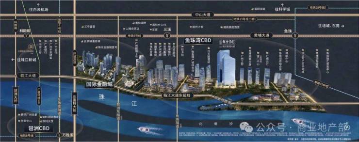 畅联全城——多维交通网 同步世界商务节奏三横城市主路:中山大道、黄埔大道、珠江前航道,从容出行,畅达全城。三纵交网汇聚:毗邻环城高速、鱼珠隧道(在建)、琶洲东隧道(规划中),通达南北,快速衔接“金融城-鱼珠-琶洲”商务区。双线地铁接驳:紧邻地铁5号线三溪站及13号线鱼珠站,无忧出行选择。醇熟商业——商务休闲圈 荟聚精彩城市生活自带约1.7万㎡裙楼商业配套,商务需求下楼即刻解决。毗邻多个繁华商圈山姆会员店、宜家、美林M·LIVE天地、居然之家、盒马鲜生,保利鱼珠时光、广物鱼珠商务中心(在建),提供了理想消费场景,满足办公娱乐一站式需求。