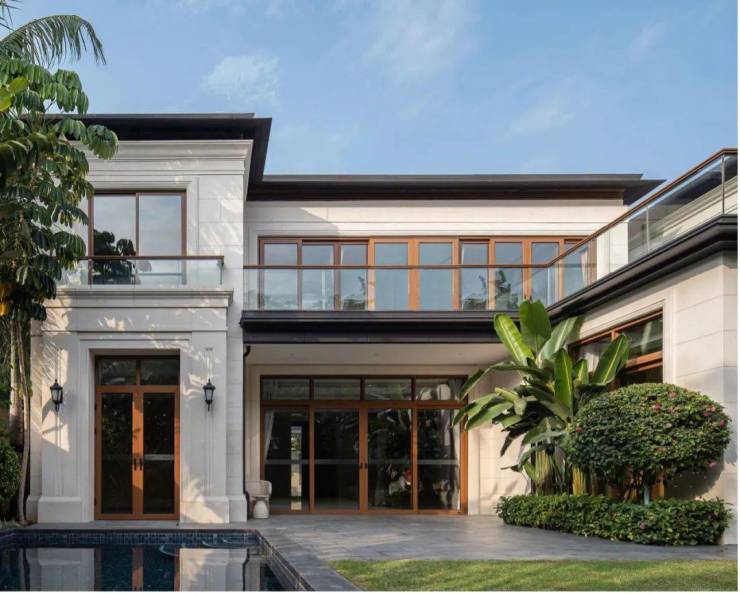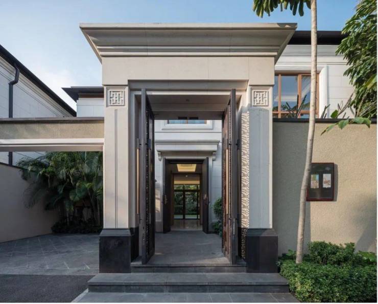 海棠潮鸣别墅统一采用二层造型,形体比例舒适宜人,墙面以仿石涂料为主,突出的门头位置采用葡米石材,主体以均衡的虚实比例及考究的细部线条营造价值感。屋顶采用仿柚木铝合金的深远挑檐及平坡结合的方式,打造热带风情和度假氛围。