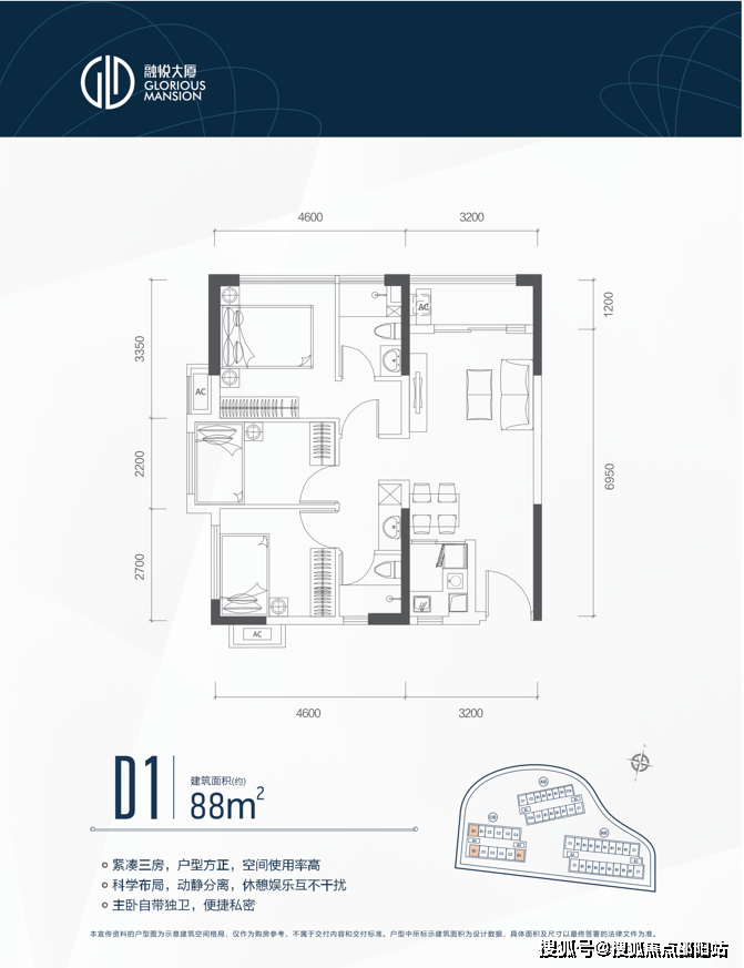 88㎡的户型,三间卧室巧妙布局,让每个家庭成员都拥有属于自己独立的空间、互不干扰。主卧是套房设计,相当于双卫设计。深圳融悦大厦开发商售楼处咨询/预约电话:400-166-9557售楼中心