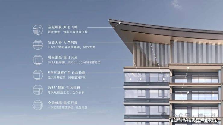 原创冠云屏:以高技法演绎高规格型材,打造高级优雅的公建化立面首创展翼飞檐:汲取传统中式建筑飞檐,用现代手法做简化演绎▻南向超80%窗墙比丨▻大面双层LOW-E玻璃丨▻35°斜切香槟金铝板▻隐框一片式玻璃栏板丨▻270°转角超长飘窗大道至简 以匠人之心细琢东方建筑风骨