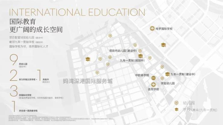 项目周边拥有15所幼儿园、4所义务教育学校,还有荔湾小学和深大附中等学校都在周边。此外项目靠近多所国际学校,拥有3000到5000个名额,包括荟同国际学校、礼德国际学校、英国国王学校(深圳分校)以及深圳哈罗国际学校。临近小区南侧有一块九年制教育用地,但目前未招标。入住早期可能要到妈湾南二外学校或者前湾南二外学校上学。