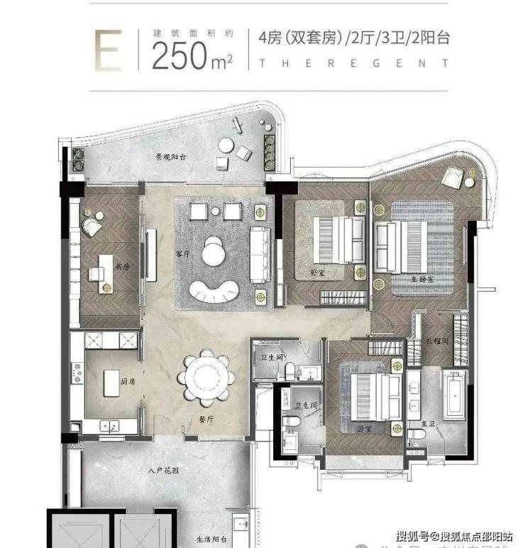 建面约250㎡:4房(双套房)2厅3卫2阳台拥