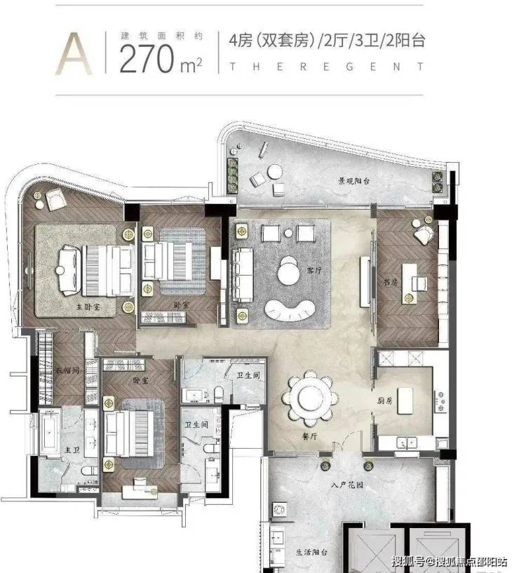 建面约270㎡:4房(双套房)2厅3卫2阳台独立电梯入户