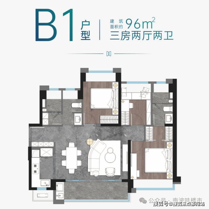 建面约96㎡三房两厅两卫