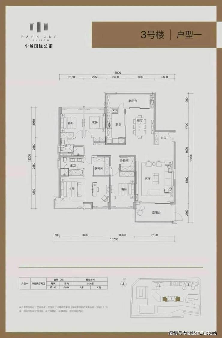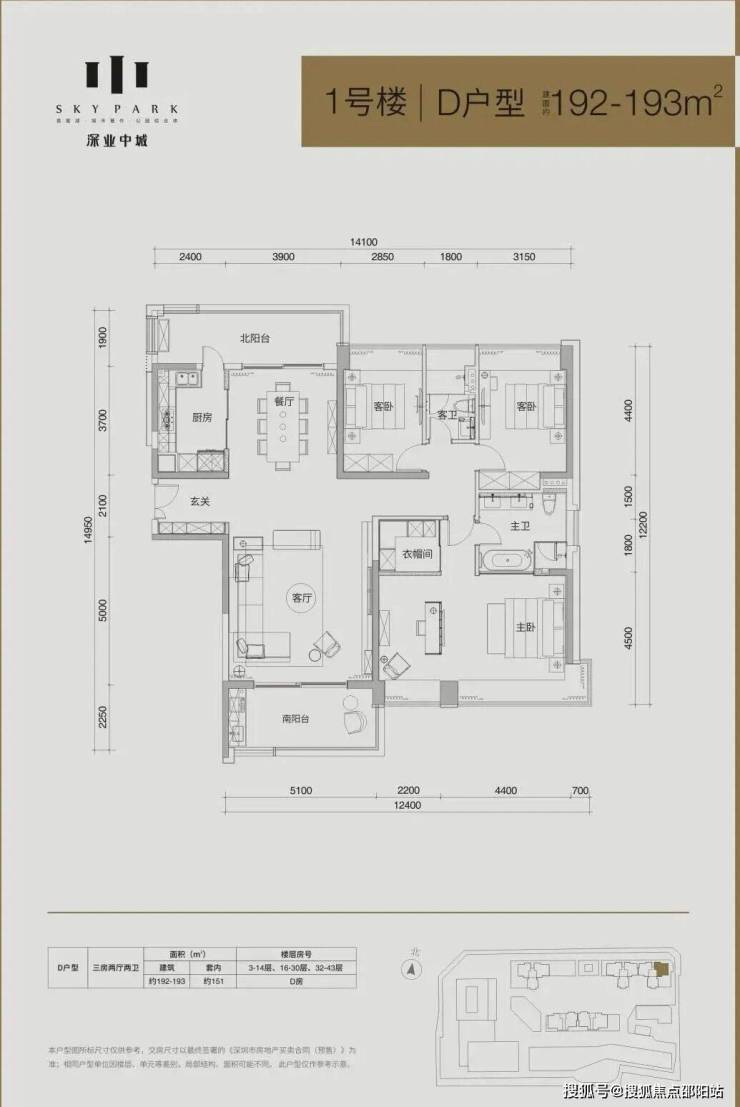 1栋产品面积段为137-185-192㎡的3房、212㎡的4房、以及4套300㎡以上的顶层复式单位,其中36层及以下为2梯3户“品”字形结构,37层及以上为2梯2户的板楼结构;