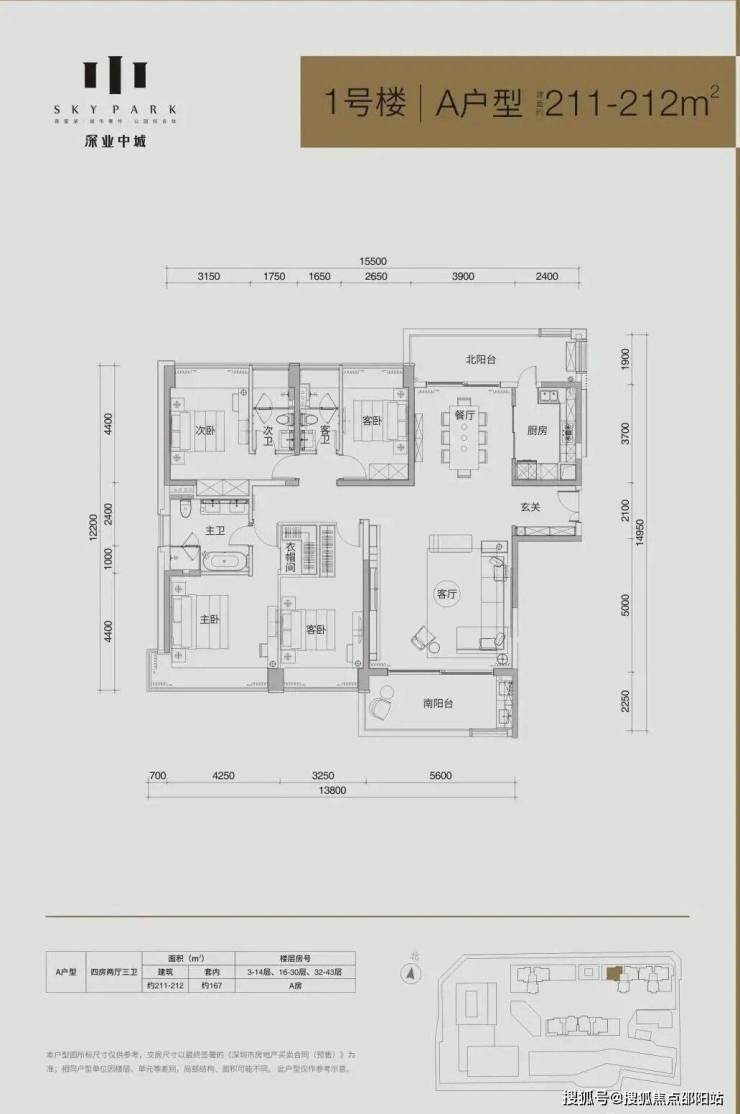 211-212㎡四房两厅三卫:套内167㎡,双套房设计,5.6米客厅开间,比193㎡户型多一个房间和卫生间,北向阳台看公园,南向阳台看城市景观,功能性和舒适度拉满。