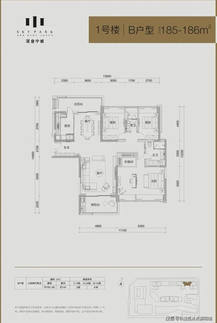 185-186㎡三房两厅两卫:套内约146㎡,动静分区明确,南北双阳台,可改为四房格局,北向直面香蜜公园,景观与实用性完美平衡;