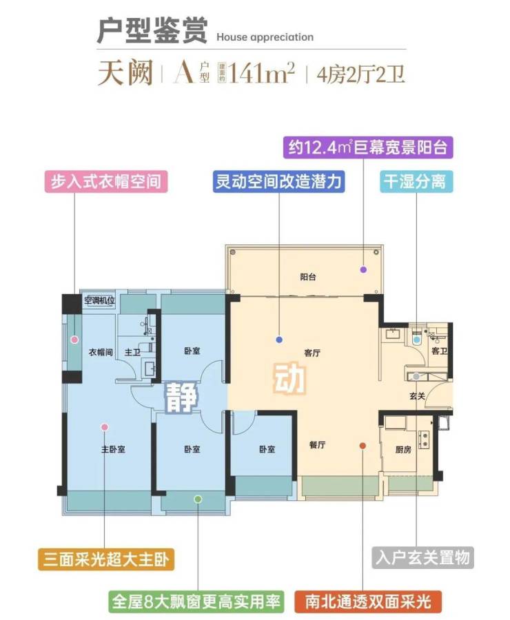 114㎡的4房2厅2卫,设计的是竖厅双龙抱珠格局,进门入户玄关,客厅3.8米的开间,LDKB一体化设计,4个卧室分别做到了3.4米/2.7米/2.6米/2.65米的宽度,客厅连接次卧出7米长的观景大阳台,U型厨房,得房率约:81.39%(不含赠送),东北朝向看科学公园。