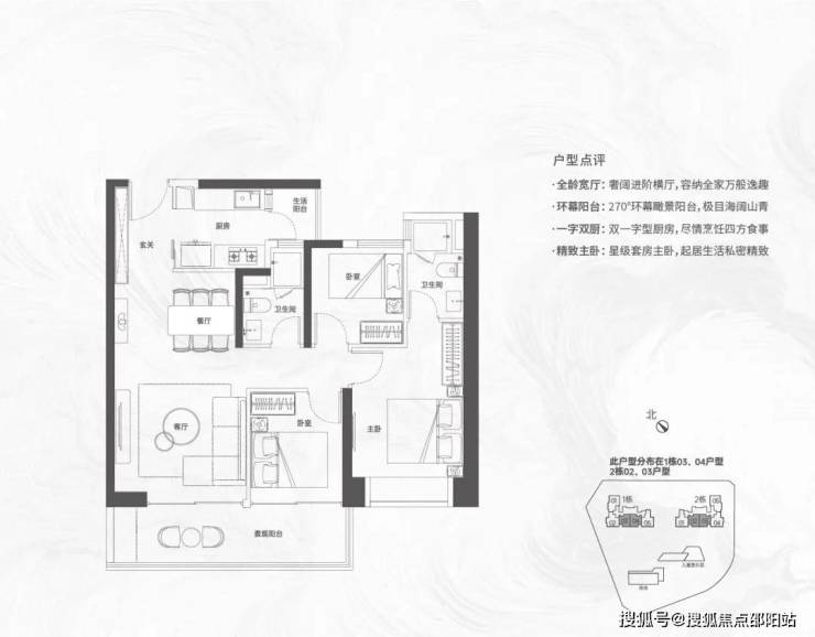 【124㎡的3+1房2厅2卫】1栋02/2栋04户型,电梯入户送独立公区,设计的是竖厅格局,动静分区,主卧套间设计,还有一个多功能间可以做书房,U型厨房,公卫三段式分离,得房率:72.07%(不含赠送)西南朝向;