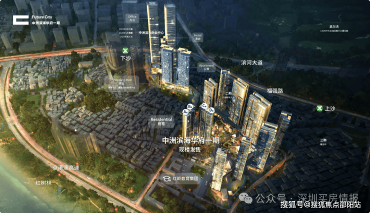 中洲湾是上沙村旧改,分四期建设,总占地约9.7万平,总建面约126万平,集海景住宅、服务式公寓、写字楼、酒店、集中式商业和商业街等多元业态为一体,是福田少有的百万级大盘。项目临近地铁7、9号线以及规划中的22号线,距离7号线上沙站约600米,距离9号线下沙站约800米,可快速到达福田口岸和皇岗口岸,广深港高铁福田站。小学和中学都是红岭实验学校(原上沙中小学),距离比较近。项目自带约16万平大型商业,包含刚刚开业的一期8万平高端Shopping Mall、二期8万平创意商业街区,与KKONE联合形成约26万平的超级城央商业圈,相当于1.5个欢乐海岸的商业体量。