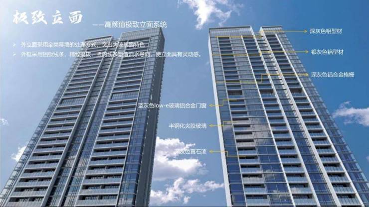 项目楼体外立面均采用全类幕墙设计,结合外挂铝板材质,打造经久不变的现代新形象。全线产品统一公区配置,精选深山原石打磨铺设,不计成本打造品质豪宅,只为匹配精英审美。荣获美国国际设计大奖、REARD全球地产设计大奖、被市住房和建设局推荐为深圳质量月“示范项目”,以高标准建造为深圳建筑品质代言。