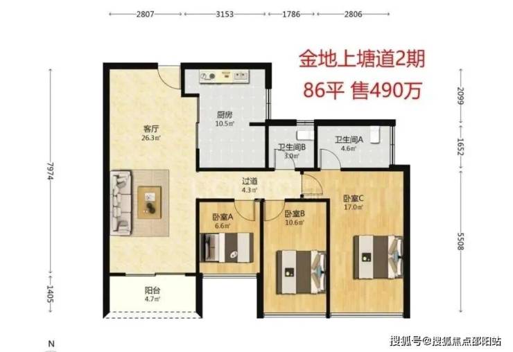 旁边的金地上塘道二期,一个89平的三房两卫户型是490万,89平的三加一房型则在500至510万之间,均价为5.7万。