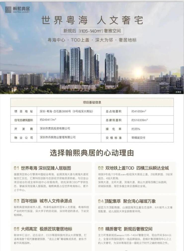 翰熙典居,逾50万㎡地标级奢居综合体,2025年深圳市重大建设项目之一。项目三个地块一次性整体开发,彰显枫叶集团雄厚实力,及打造中心人文奢宅、城市地标之作的恢弘之志。