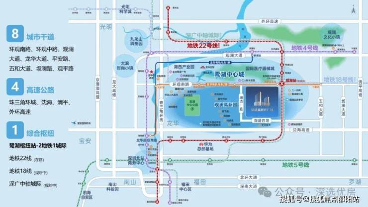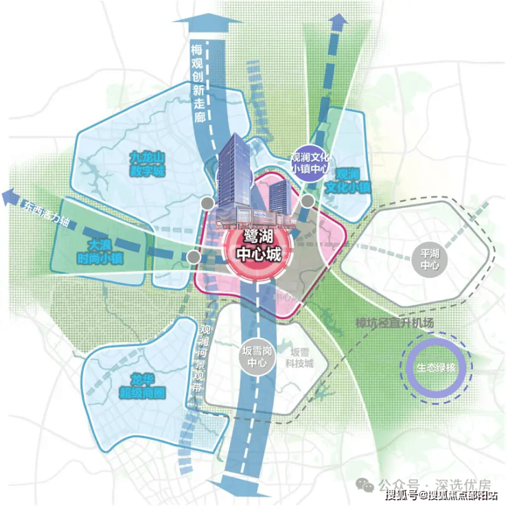龙华产核——鹭湖中心城地处龙华万亿级数字经济圈、梅观创新走廊的交汇中心,亦是龙华六大重点片区的核心枢纽