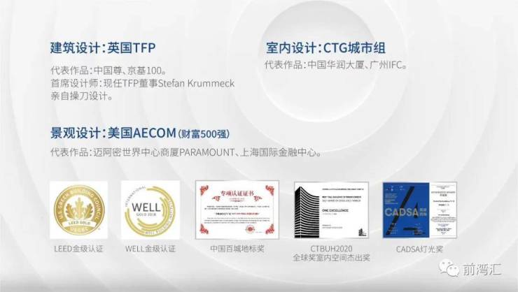 国际团队联合打造 英国TFP Farrells、AECOM、CTG等50余家国际一流设计单位获誉无数,LEED金级认证、CTBUH2020全球奖室内杰出奖、美国LIT照明设计奖等