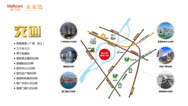 项目毗邻五条主⼲道(厚街⼤道、港⼝⼤道、东莞⼤道延⻓线、莞太路、环莞快速),双⾼速(沿江⾼速、⼴深⾼速),四轨道(地铁R2线、莞惠城轨、穗莞深城轨)形成了得天独厚的便利交通⽹络。