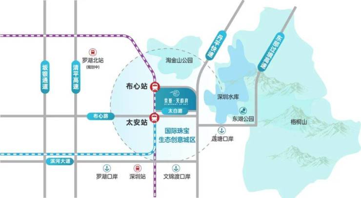 项目距离地铁5号线布心站约250m、距离地铁5、7号线太安站约500米。周边近享2高铁、3口岸、4快速,通达全城,三大口岸年通关量5876万人次,地铁旁物业坐享深港两地海量商机人流。