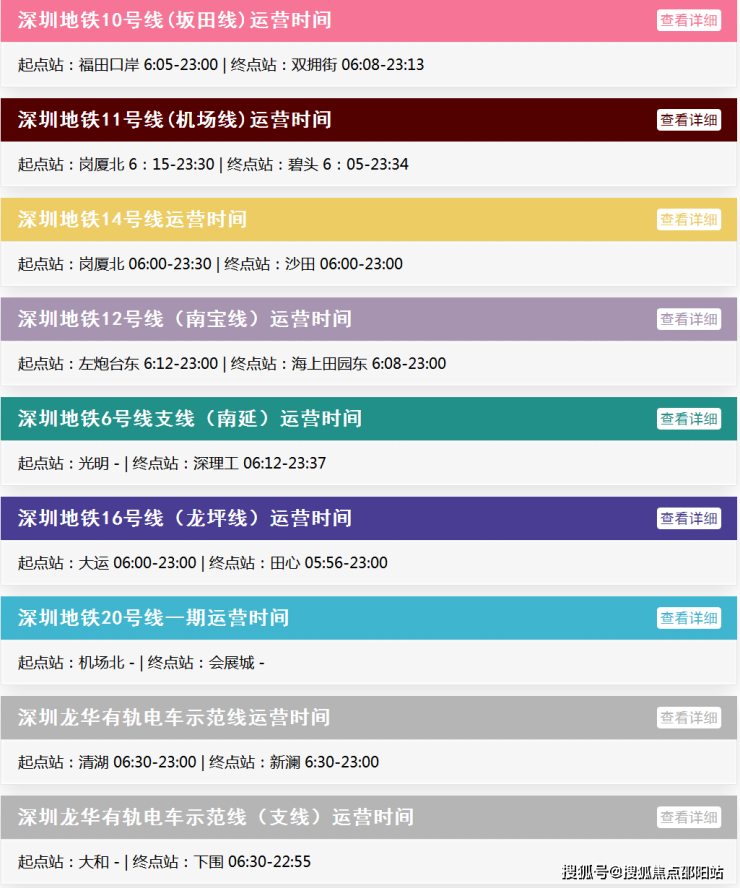 以各线路的起点站为例,首班车发出时间大部分在6:00-6:30之间,末班车发出时间23:00-0:00之间。如果该站点为换乘站,那么不同线路的运营时间也会有所区别。
