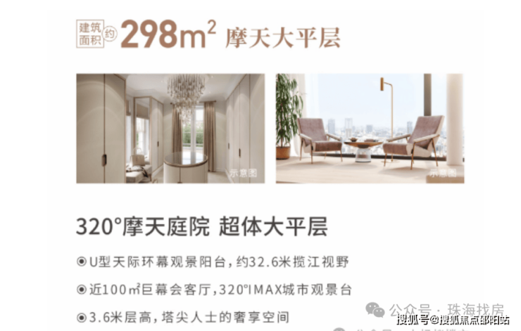远超现有标准极限的约38.6米U型大阳台,320°摩天庭院、全屋落地窗、约3.6米舒适层高、约120㎡巨幕会客厅等极致的尊崇,刷新城市封面格局。