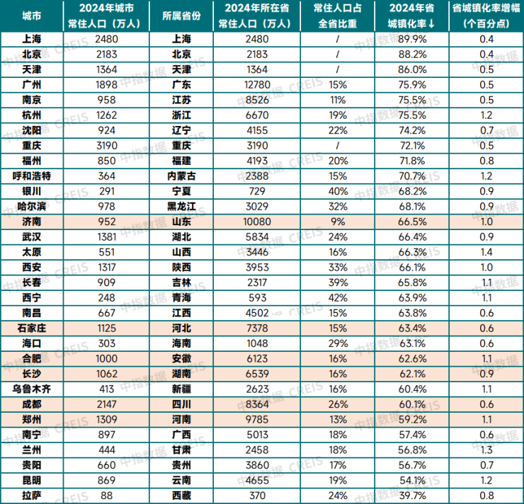 从主要省份来看,广东、江苏、浙江、辽宁、福建城镇化率较高,2024年城镇化率均在70%以上。山东、河北、安徽、湖南、四川、河南等省份常住人口规模较大,但城镇化率仍低于全国平均水平,其中河南省拥有近1亿常住人口,城镇化率仅59%;四川省超8000万人口,城镇化率仅60%;另外,西南的广西、贵州、云南等省份城镇化率均低于58%,未来这些省份城镇化仍有较大提升空间,在此过程中,区域中心城市有望成为人口主要流向地。