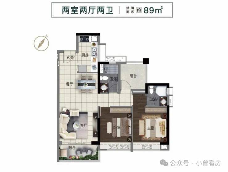 89㎡户型三开间朝南,南向望园林,独享阳光景观,主卧套房设计,更具私密性。