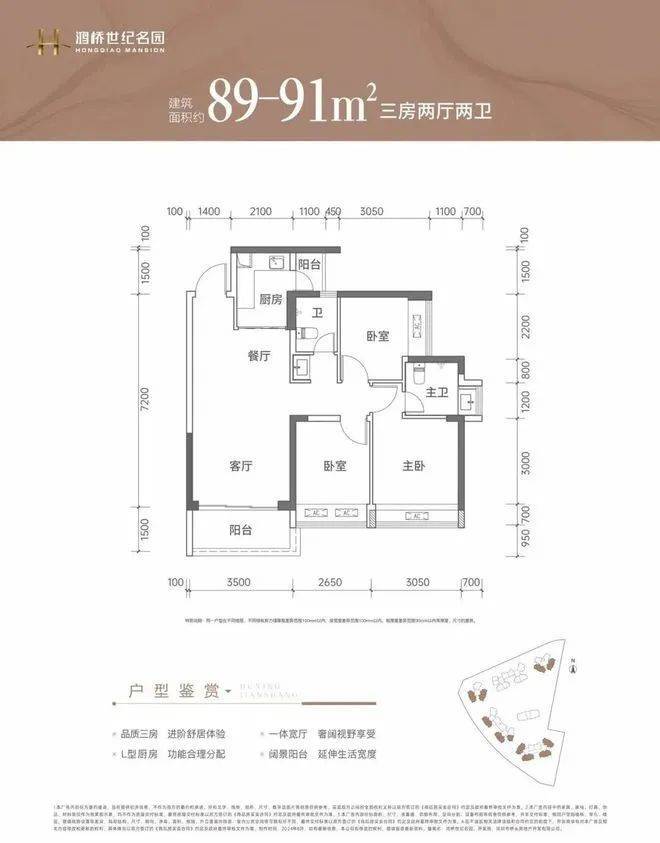 91㎡的3房2厅2卫:竖厅南北通透格局,客厅3.5米开间,LDKB一体化设计,3个卧室分别做到了3.05米/2.6米/2.55米的宽度,L型厨房带1个小生活阳台,卫生间干湿分离,阳台主朝正北向。✨✨鸿桥世纪名园开发商电话:400-859-7606【售楼处已认证】✨✽✽✽✽