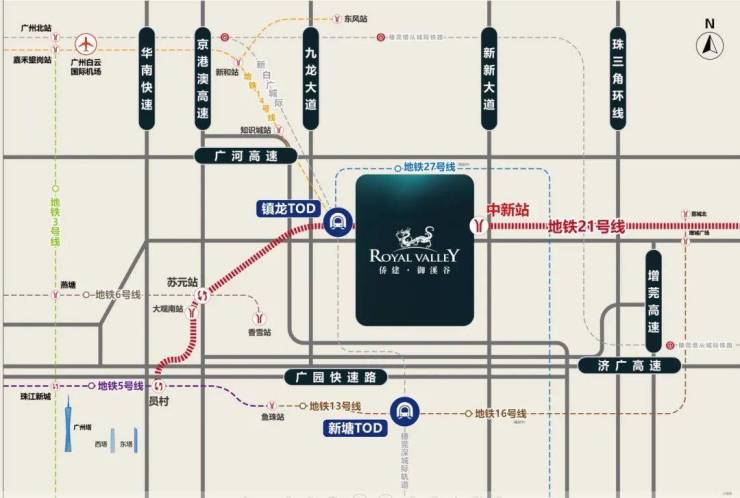 拥有四纵六横的交通网络,堪称广州东核心交通枢纽,是广州罕有的7地铁口上盖别墅物业。地处地铁21号线中新站之上,4站即达天河,1站可到镇龙TOD枢纽。