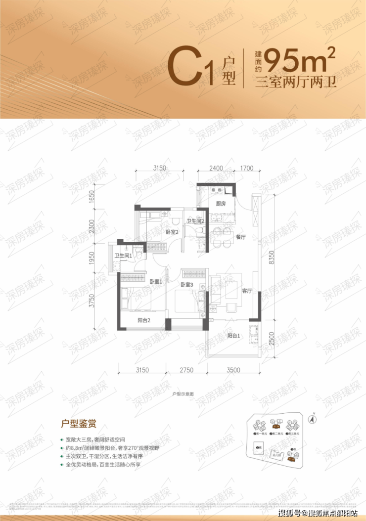 95㎡的3房2厅2卫,设计的是经典竖厅格局,客厅3.5米开间,进深8.35米,LDKB一体化设计,三开间朝南,3个卧室分别做到了主卧13.8㎡/次卧10.31㎡/次卧9.13㎡(包含墙体飘窗),U型厨房,公卫三段式分离,得房率约90%(包含赠送),西南或正南朝向。