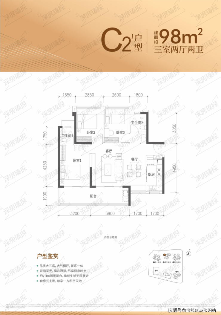 98㎡的3房2厅2卫,设计的是横厅南北通透格局,客餐厅5.6米开间,LDKB一体化设计,四开间朝南,3个卧室分别做到了主卧13.6㎡/次卧10.4㎡/次卧9.49㎡(包含墙体飘窗),U型厨房,公卫三段式分离,得房率约90.2%(包含赠送),阳台主朝正南向。