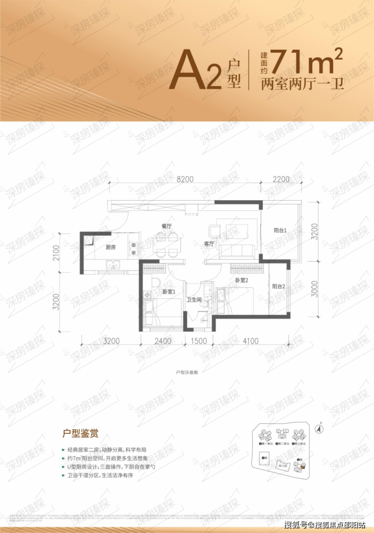 71㎡的2房2厅1卫,设计的是竖厅格局,客厅3.2米开间,进深8.2米,LDKB一体化设计,2个卧室分别做到了主卧12.5㎡/次卧9.12㎡(包含墙体飘窗),U型厨房,卫生间干湿分离,得房率约88%(包含赠送),东南朝向.