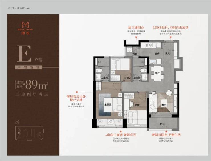 89㎡的3房2厅2卫,A户型(1栋1单元06户型),设计的是经典竖厅格局,进门入户玄关,LDKB一体化,S墙设计预留冰箱卡槽位,三开间朝南,动静分区,主卧双面大飘窗,客厅连接次卧出5.6米长的观景阳台,U型厨房,公卫三段式分离,东南朝向。