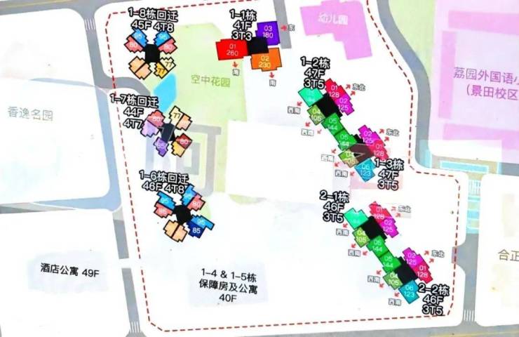 :10栋超高层住宅(1栋1单元43层,1栋2/3单元43层,1栋6-8单元45层等)+1所幼儿园。