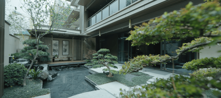 光是约200-350㎡的首层花园,尺度就足以让人惊叹。正方摒弃夸张的堆砌,借景天地自然,将名贵树种、观景鱼池、茶艺室等元素融入其中,极具美感与意韵。
