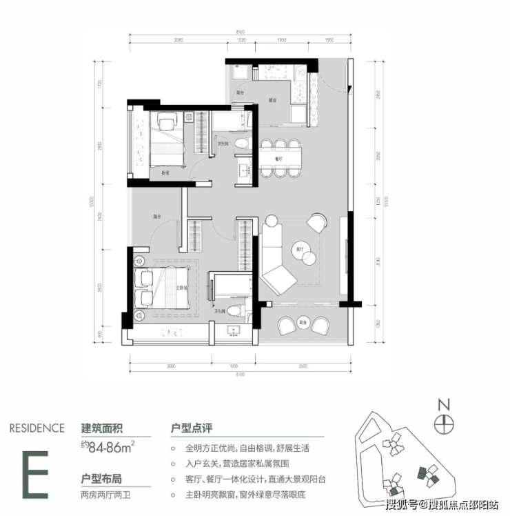约84㎡的产品比较稀缺,分布在2栋和3栋,一共四条腿,朝南和朝北的都有。