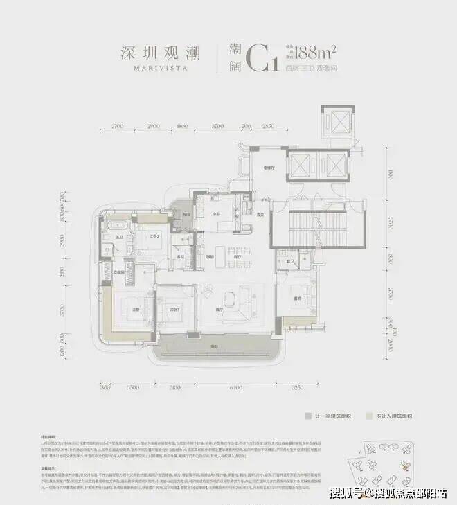建面约188㎡的户型四房三卫双套间