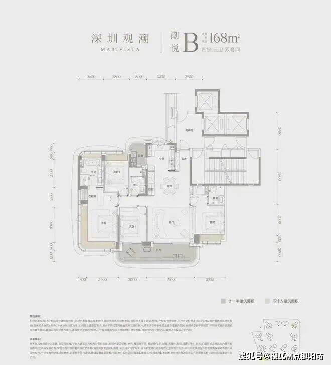 建面约168㎡的户型四房三卫双套间