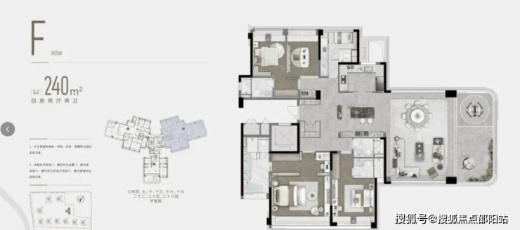 空中院墅户型:122-240平方米,四至五房,配备环绕式三错层超大露台,部分户型挑高9米,可打造空中庭院。