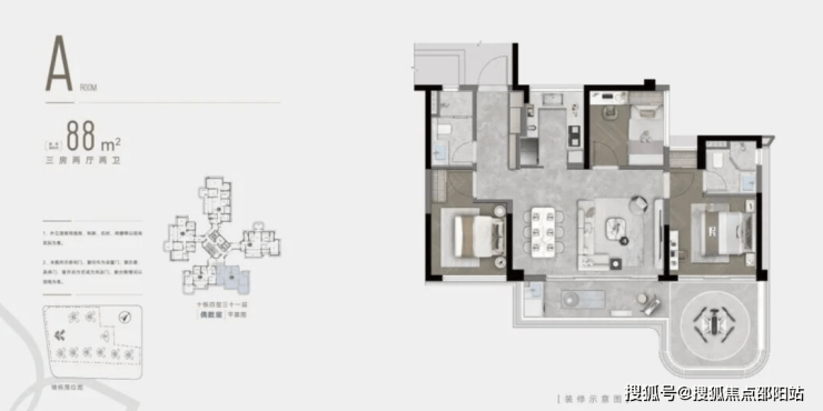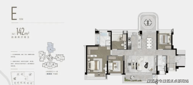 高层阔景户型:88-142平方米,三至四房,主打南向采光、大露台设计,实得率超100%。