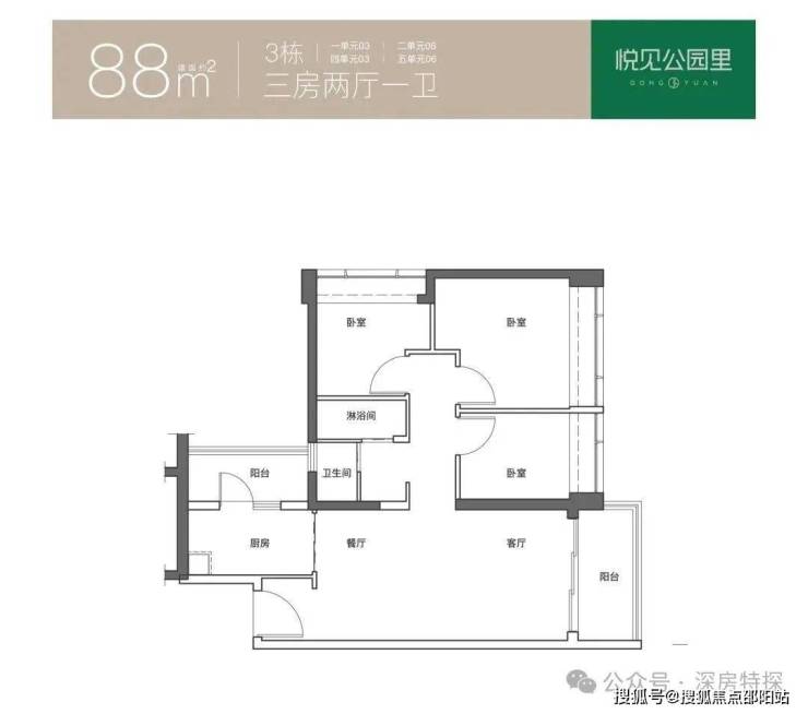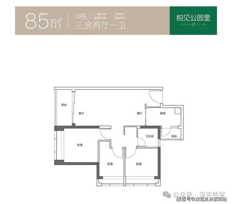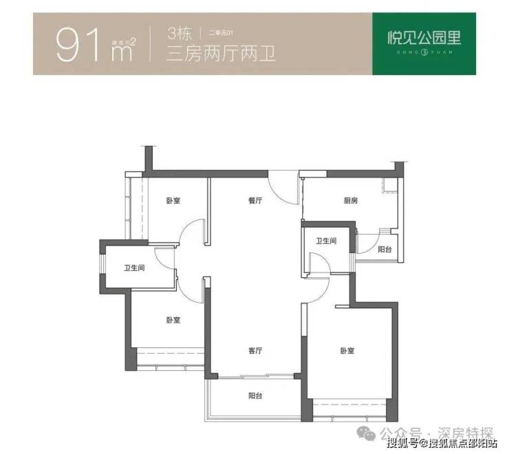 面积有85-88㎡的3房2厅1卫,91-94-95-97-110㎡的3房2厅2卫,120㎡的4房2厅2卫户型