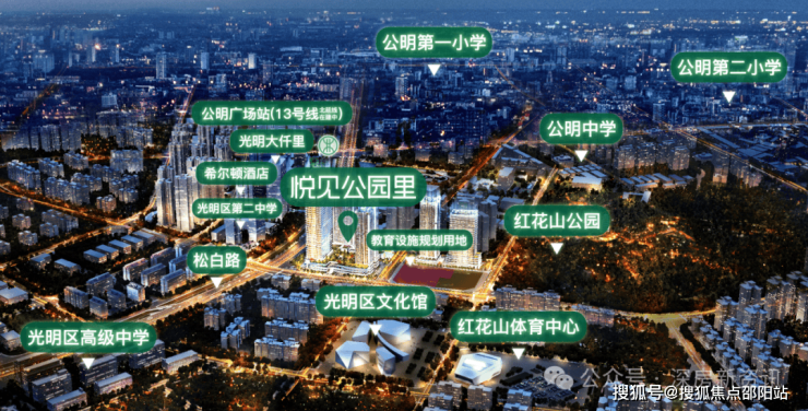 项目约2公里范围内,近享红花山体育中心、光明图书馆红花山分馆、文化馆等城市人文配套。外侧北邻约27万方红花山公园, 内侧遵循自然之理,与公园绿地共生,目光所及之处,是公园的四季更迭。