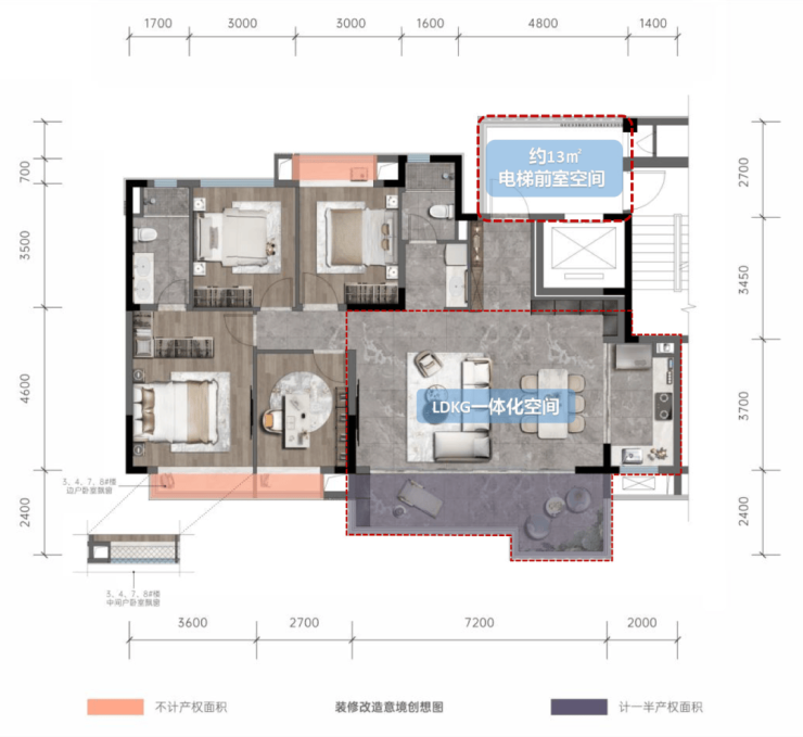 成都龙湖三千云锦建筑面积约143㎡,实际可使用面积可达140㎡,一户“独享”的约13㎡的电梯前室空间。