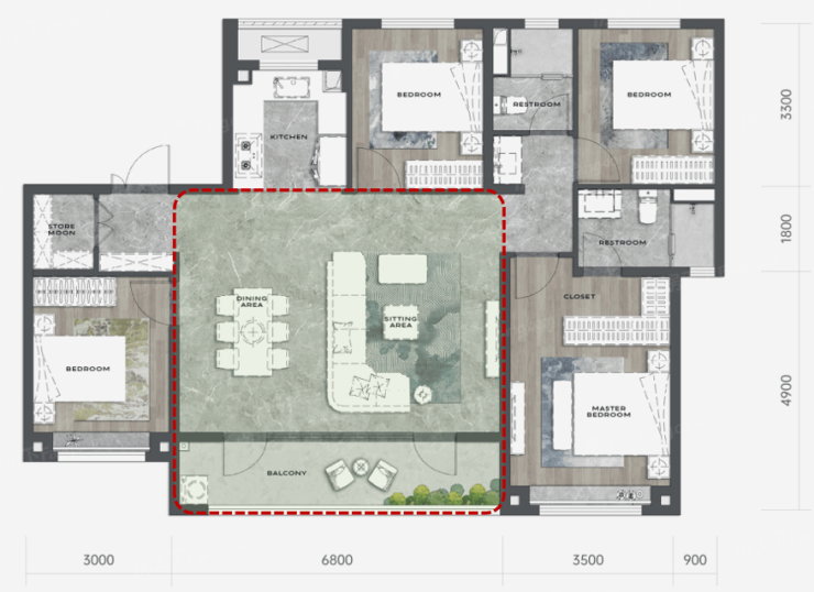 灵活可变的南向三大奢阔卧房设计,可满足不同家庭不同阶段的生活需求。其中,如将次卧和客厅连通之后,还可以打造成为超级宽厅,演绎多样生活场景。