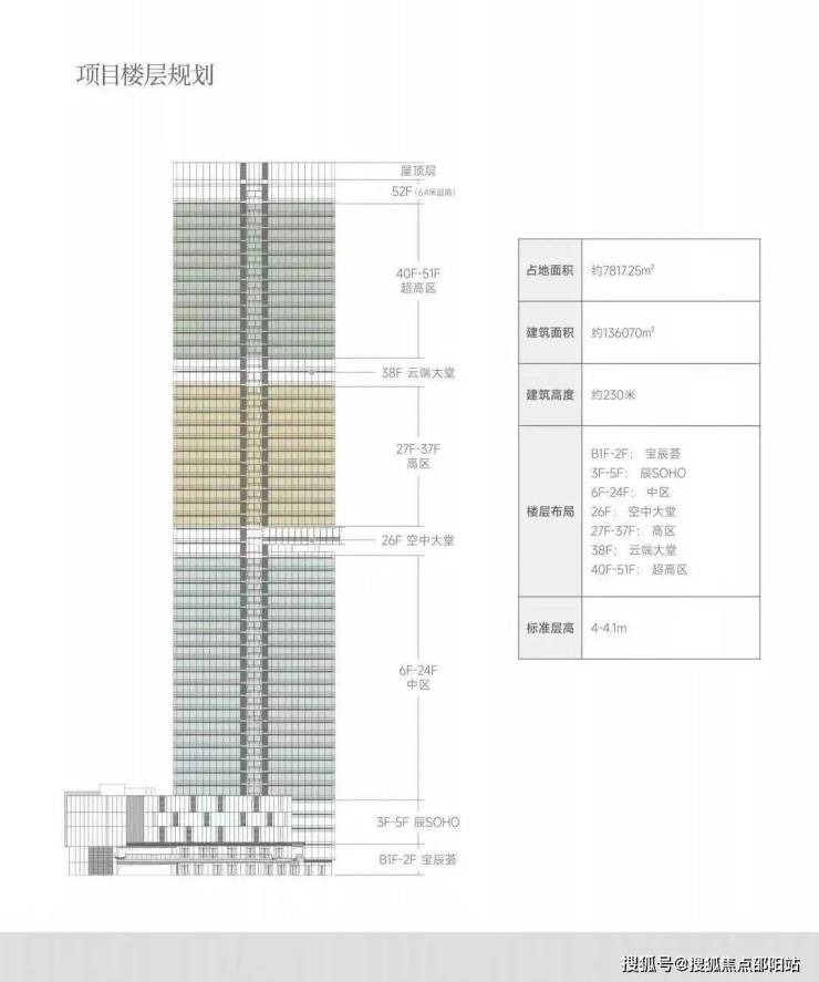 华侨城宝辰总高230米,为宝中最高楼;项目52层,分为中区、高区、超高区,6层起卖,11、39F为避难层,25-26F为空中会所,28F为空中大堂。除了空中大堂项目还有地下入库大堂+首层大堂,一共三重大堂。