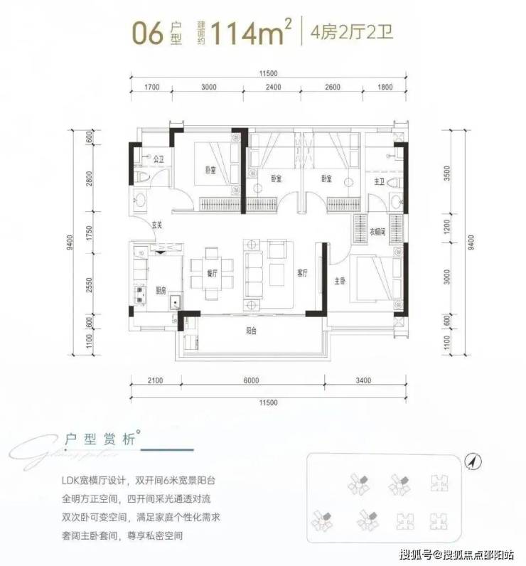 建面约114㎡是传统短进深大开间横厅格局,通透性很好,客厅进深6米,开间4.3米(不含阳台),配有6米宽景阳台,主卧套间设计,配衣帽间和三段式卫生间,这个户型很比较讨喜年轻的购房群体。