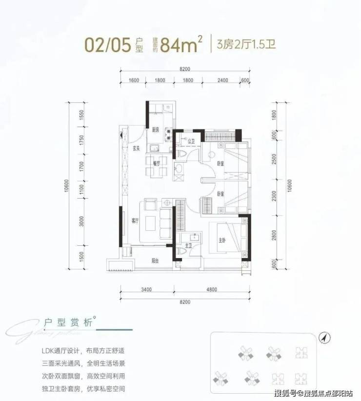 建面约84㎡是传统竖厅动静分区格局,客厅进深7.55米(不含阳台),开间3.4米,主卧8.4㎡(不含主卫和飘窗),空间确实会偏紧凑一点,但没什么硬伤,实用性还是非常不错的。