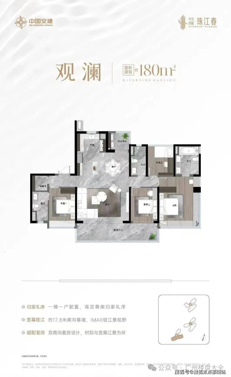 建面约143㎡四房,从玄关一进来,直面约57㎡大方厅,中间没有隔墙,奔腾的珠水直接“涌入”阳台、餐客厅,甚至下厨也能与珠水不期而遇。中交四航·珠江春售楼处电话:400-150-5057