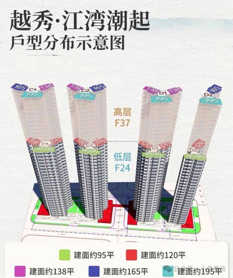 项目共规划4栋住宅楼,均为37层,分高低区设计,而且梯户比跟户型都各不相同:
