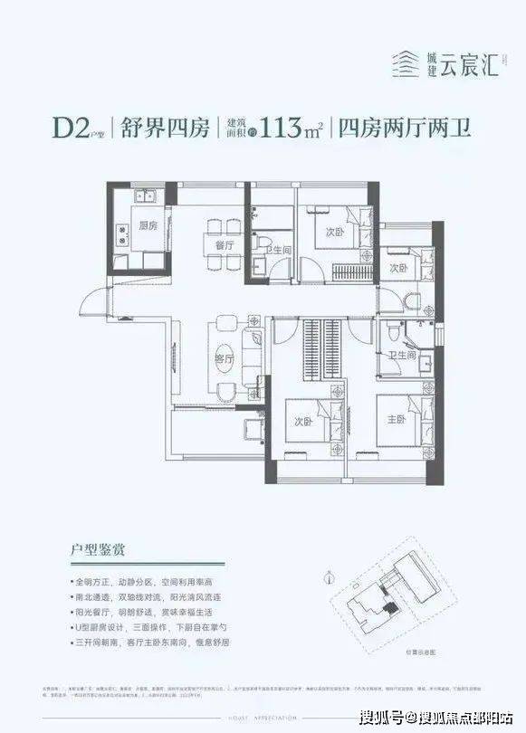 113㎡的4房2厅2卫,设计的竖厅南北通透格局,餐客厅一体化,U型厨房,阳台东南朝向。