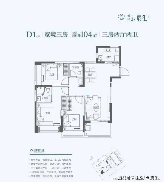 104㎡的3房2厅2卫,设计的竖厅南北通透格局,餐客厅一体化,U型厨房,阳台西南朝向。